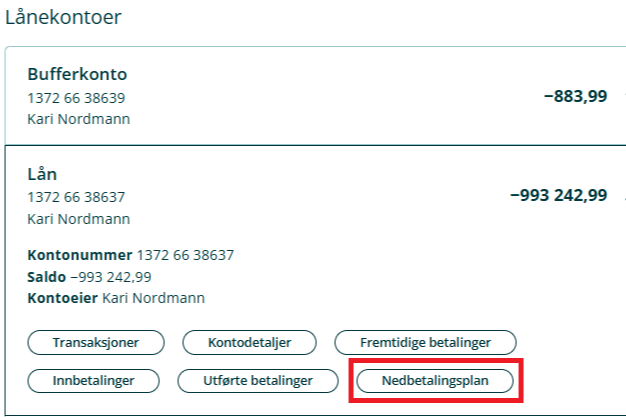 - Under «Lånekontoer» velg lånet du ønsker å se på og trykker deretter på «Nedbetalingsplan»
